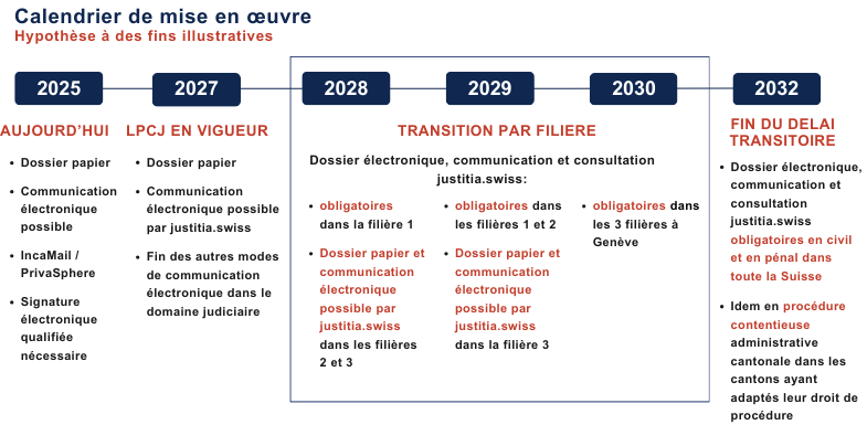 It presupposes the adoption of an appropriate legal framework, at both federal and cantonal levels. This transition also involves adapting the working procedures of the judicial authorities, their information systems, the workstations of the magistrates and collaborators as well as the courtrooms.