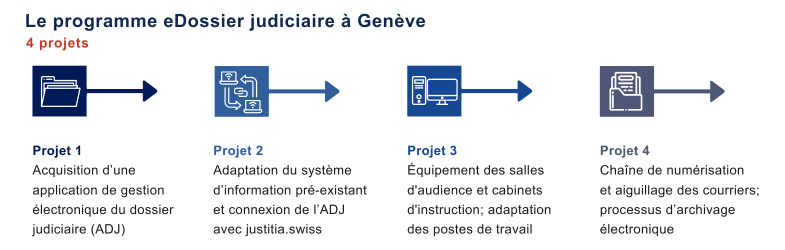 The national project does not aim to achieve the digital transition of each judicial authority on its own. It is up to the cantons to implement the necessary projects to this end. The Geneva Judicial power is conducting an internal project called eDossier judiciaire, designed to adapt work processes, information systems, equipment, courtrooms and workstations for staff and magistrates.