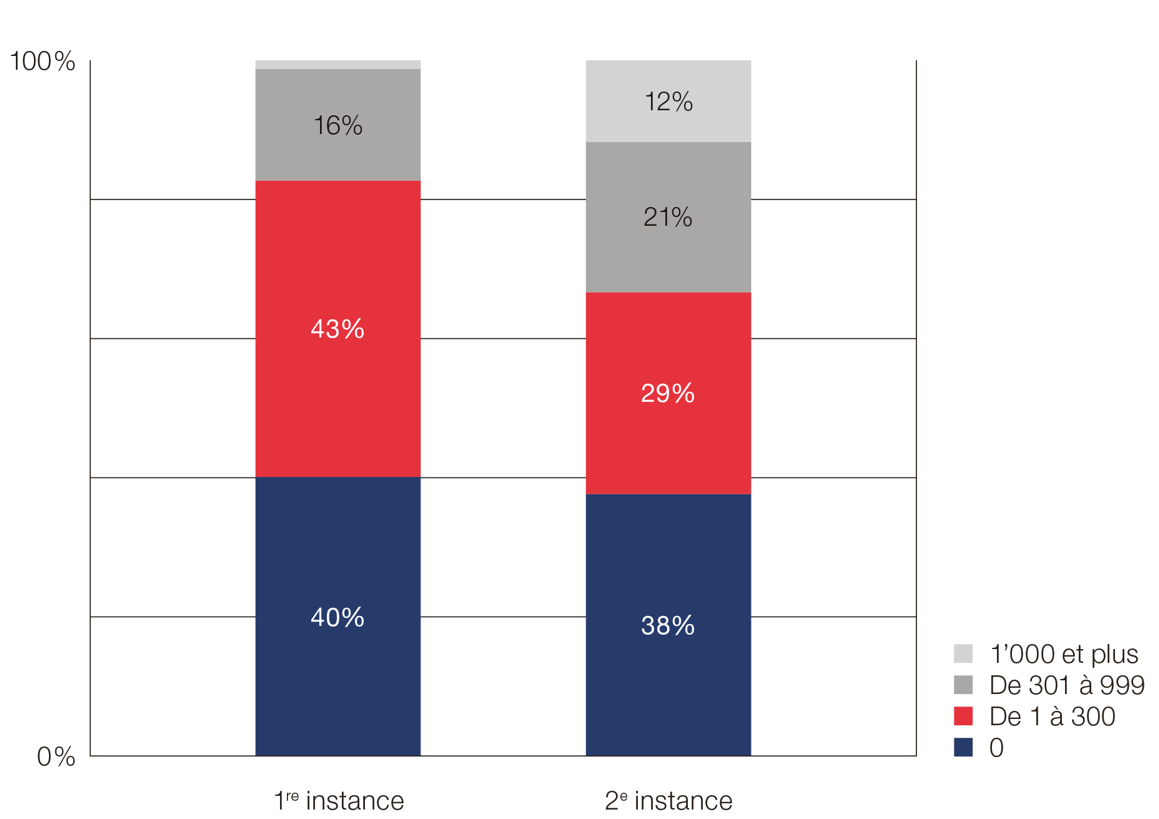 In general, more than 90% of proceedings cost less than CHF 1'000.-, and more than 80% of proceedings at first instance cost less than CHF 300.- (compared with around 70% at second instance).
